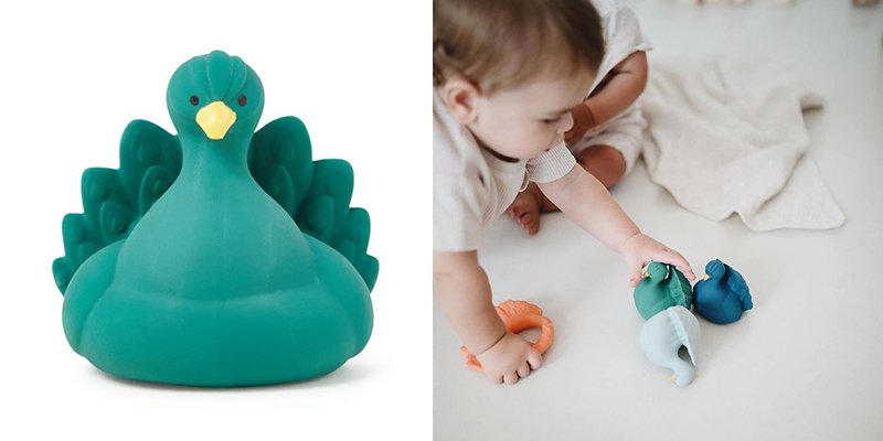 Deze kleine pauw van Natruba is een parel om te zien. De prachtige blauwgroene kleur, z’n lieve uiterlijk – het is weer eens iets anders dan de standaard badeend. Gemaakt van zacht natuurrubber, met verschillende oppervlakken om zintuigelijk spelen aan te moedigen. – 8×7,5 cm – Schoonmaken met licht, zeepwater en een vochtige doek – Vrij van PVC, BPA, ftalaten, en nitrosamines.