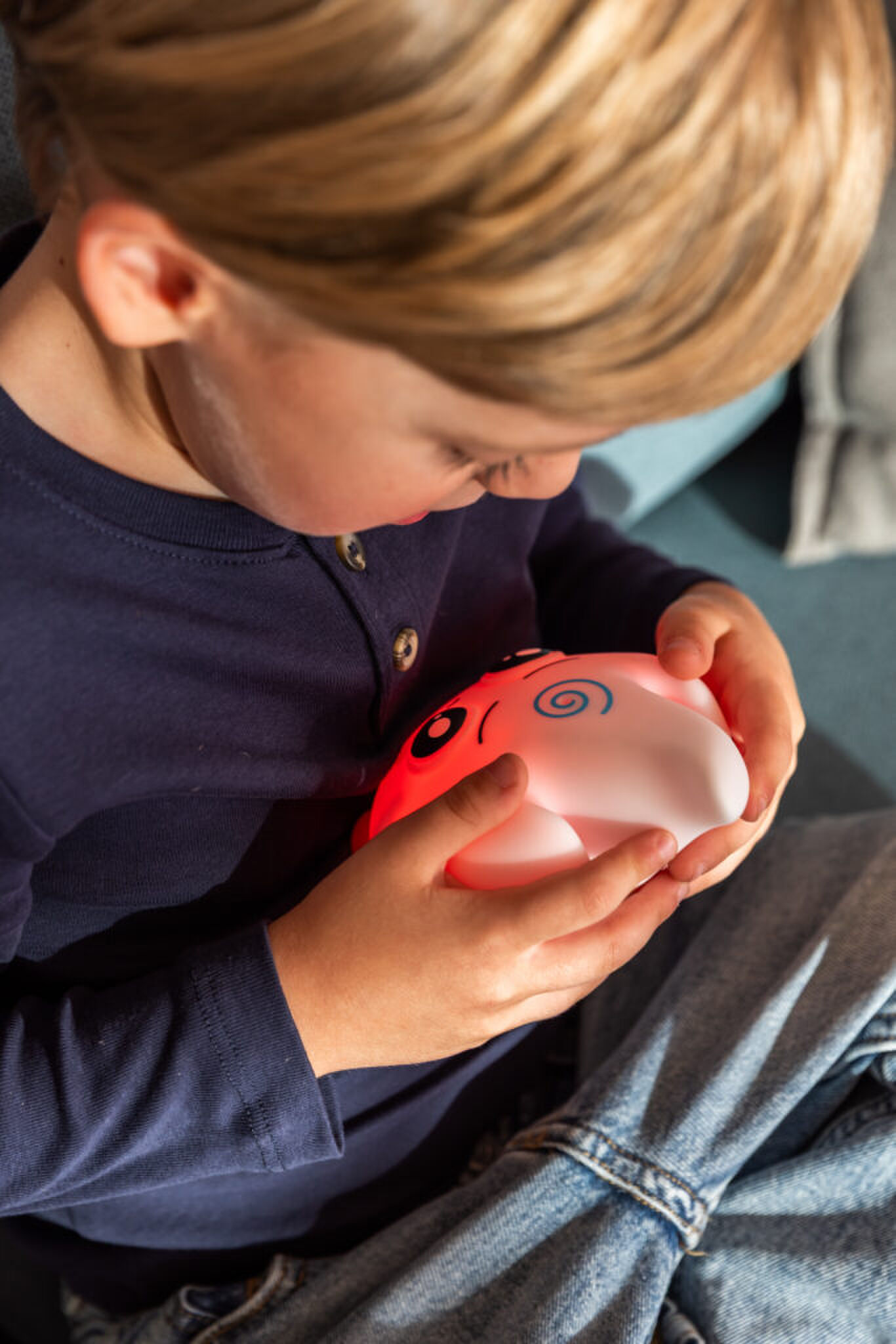 De favoriete Moodie van haar peuter is Calmy. Hannah: “Dit kleine vriendje helpt Livia haar boosheid en spanning te reguleren. Ze drukt op een knop, blaast op de spiraal van Calmy en langzaam verandert het kleurpatroon terwijl ze leert om diep adem te halen. Stopt ze met blazen, dan kleurt Calmy rood. Een subtiele manier om haar bewust te maken van haar boosheid. Na een paar minuten blazen wordt Calmy licht en voelt Livia zich rustiger. Het is zo’n eenvoudig, maar krachtig hulpmiddel, dat zelfs ik soms vergeet dat het “speelgoed” is.