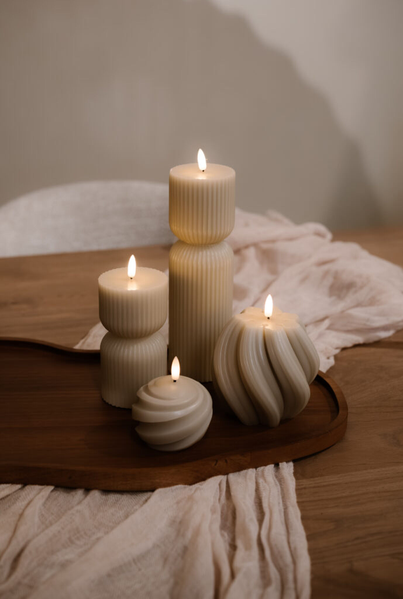Alle kaarsen zijn voorzien van een handige timer: na zes uur gaan ze vanzelf uit en achttien uur later weer aan. Zo heb je elke dag automatisch sfeer in huis, zonder dat het op de mental load lijst in je hoofd hoeft. Ze hebben allemaal dezelfde zachte beige kleur, maar verschillen in vorm en structuur. Mix & match ze voor een speels geheel op tafel, in de kast of op de vensterbank.