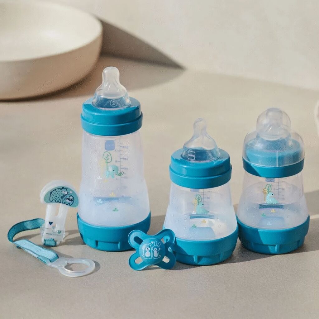 Deze cadeauset bevat 2x MAM Easy Start™ Anti-Colic babyfles 160 ml, 1x MAM Easy Start™ Anti-Colic babyfles 260 ml, 1x MAM Original Start speen (fopspeen) voor pasgeborenen en 1x MAM Clip — handig om de fopspeen vast te maken zodat hij niet kwijtraakt. De flessen hebben een zachte, platte speen die op de borst lijkt, ze zijn ‘anti-colic’: dankzij de speciale speen en ventilatie in de fles wordt de luchttoevoer gereguleerd, waardoor het slikken van lucht (en dus krampjes) verminderd wordt. De speen is klein en orthodontisch, dus geschikt voor een pasgeboren baby en vriendelijk voor kaak- en tandontwikkeling. Kies een kleur naar keuze.
