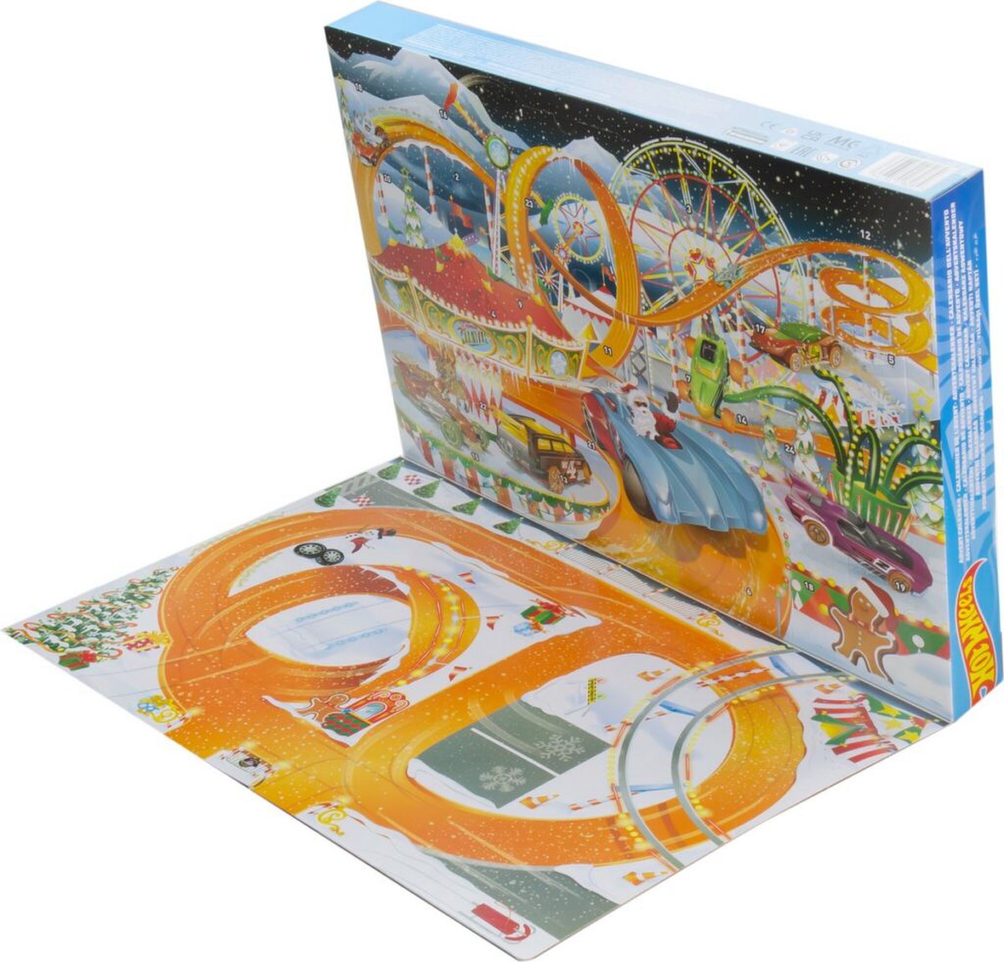 Elke dag een nieuw race-avontuur met de Hot Wheels Adventskalender. 24 vakjes vol verrassingen: 8 Hot Wheels auto’s en 16 verrassingsaccessoires om zelf een kerstracebaan te bouwen. Met de uitklapbare speelmat kunnen kinderen meteen hun Hot Wheels-avonturen beleven. Perfect voor kleine autoliefhebbers.