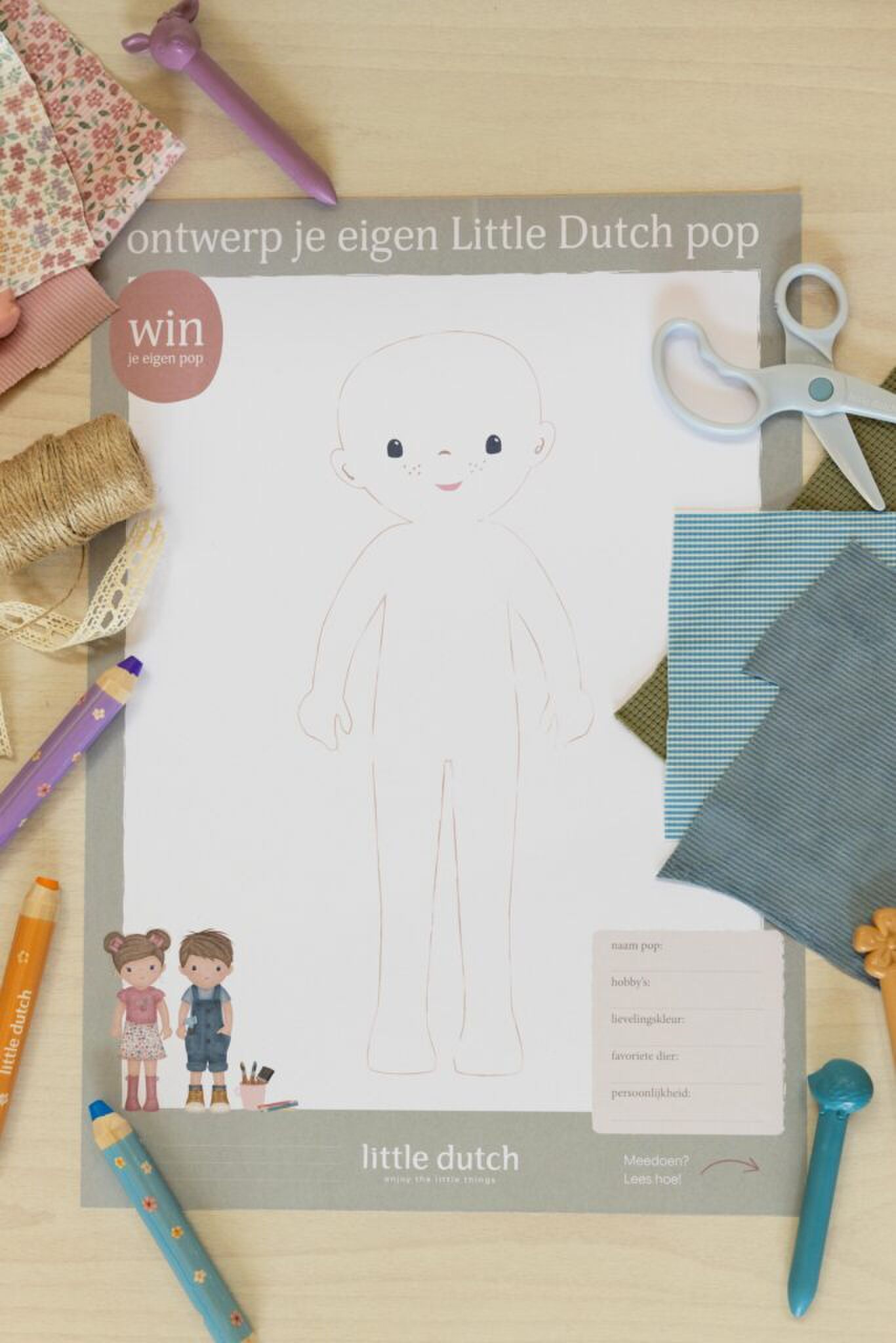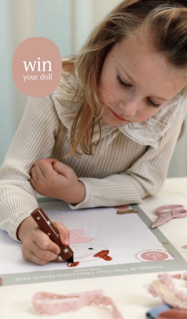 De ontwerpwedstrijd hoort bij de lancering van een nieuwe poppencollectie van Little Dutch. Die bestaat uit dertien verschillende knuffelpoppen, elk met een eigen karakter. Zo is Rosa een creatieve avonturier die graag buiten speelt en altijd nieuwe plannen verzint. Evi danst het liefst de hele dag op muziek en Jim bouwt met een hoofd vol ideeën aan zijn eigen wereld.