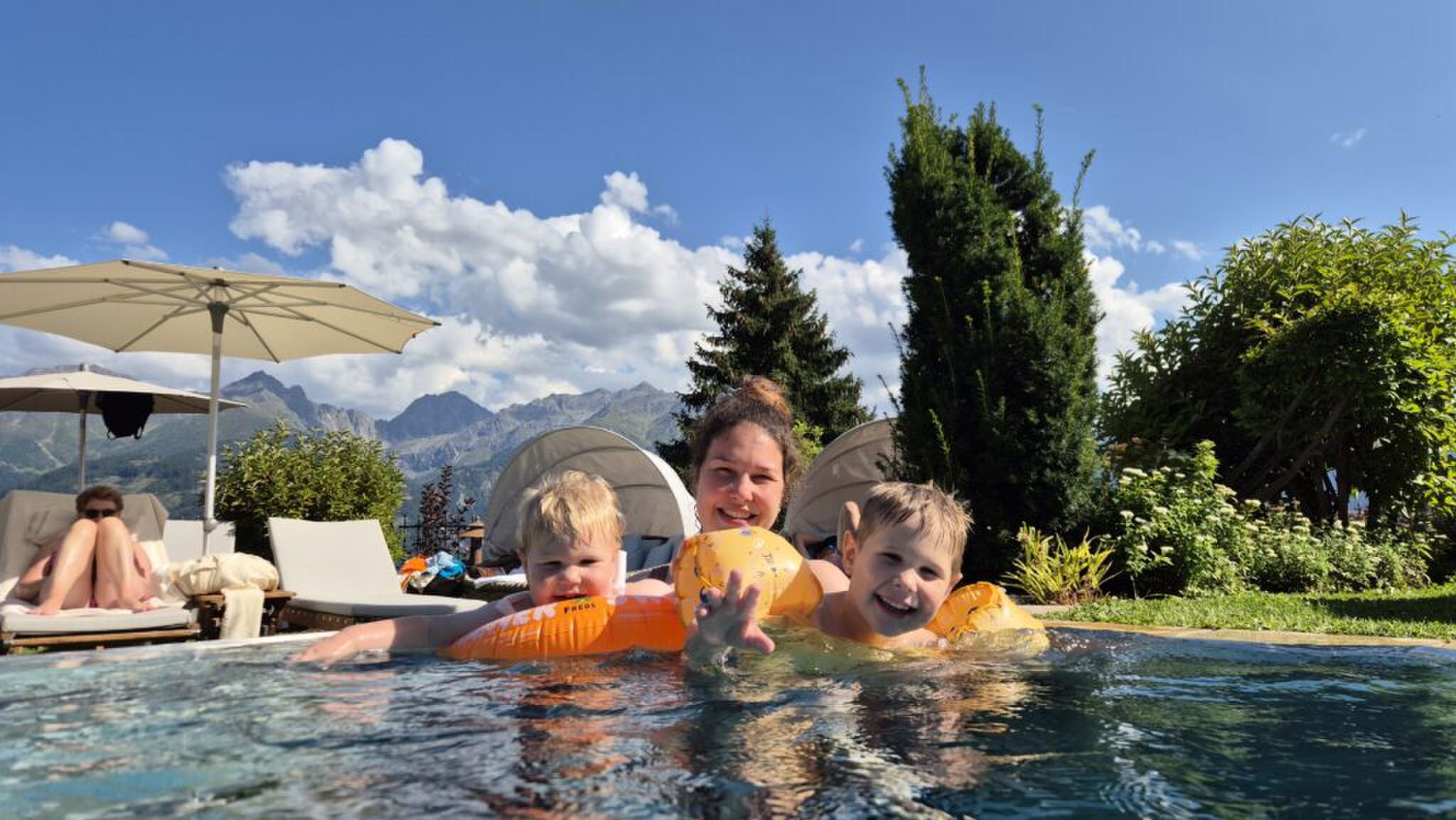 Buitenzwembad met verwarmde zones en hydrotherapie-ligbedden, om te relaxen met frisse berglucht en van het uitzicht te genieten.