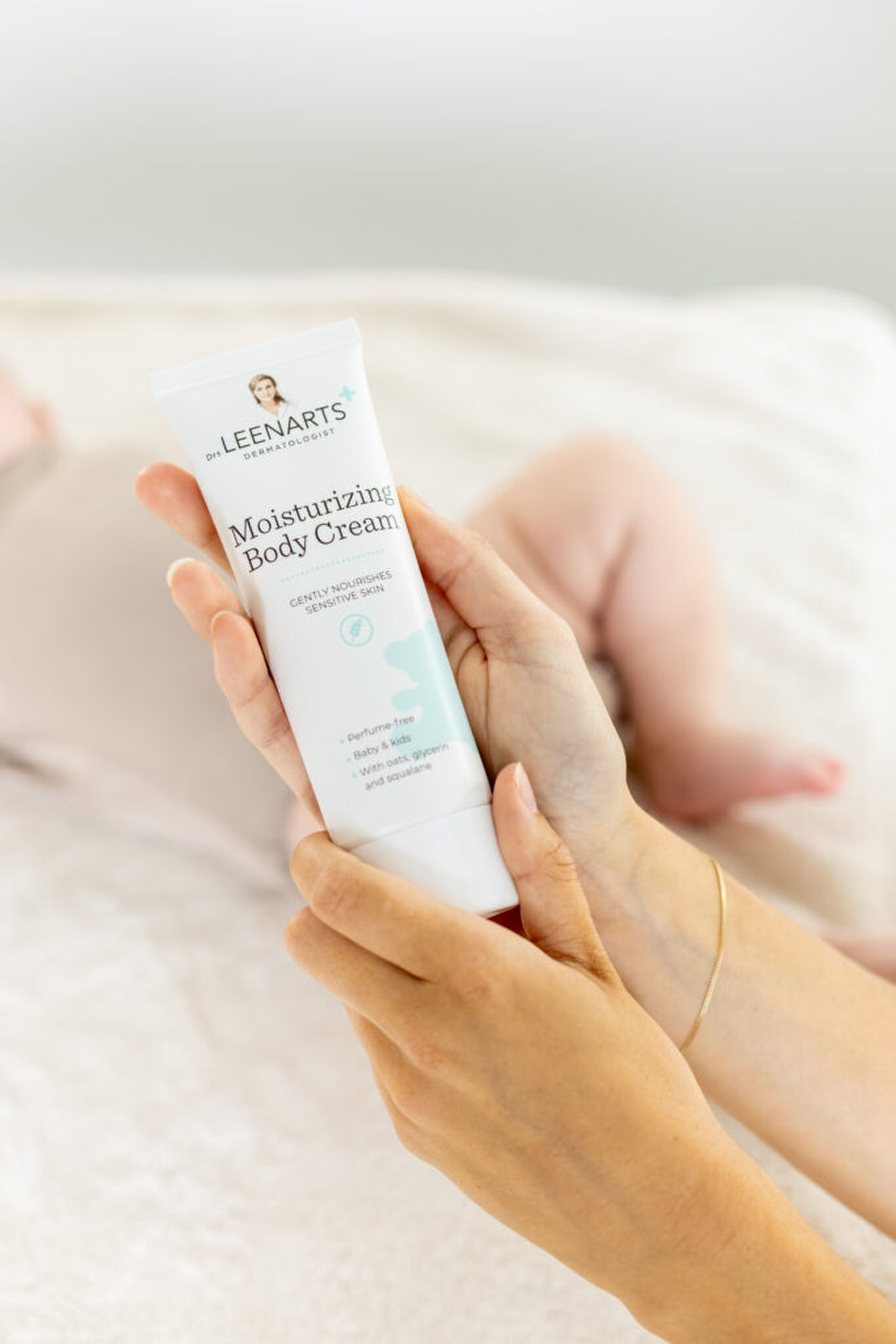 De nieuwe Moisturizing Body Cream van Drs Leenarts is zó mild dat je ’m al vanaf dag één kunt gebruiken. Met haver, squalaan en glycerine verzorgt en herstelt deze parfumvrije crème de huidbarrière. Perfect voor de gevoelige babyhuid én fijn voor de rest van het gezin. Want minder poespas betekent minder kans op irritatie. Geschikt voor mini tot mama, elke dag opnieuw.