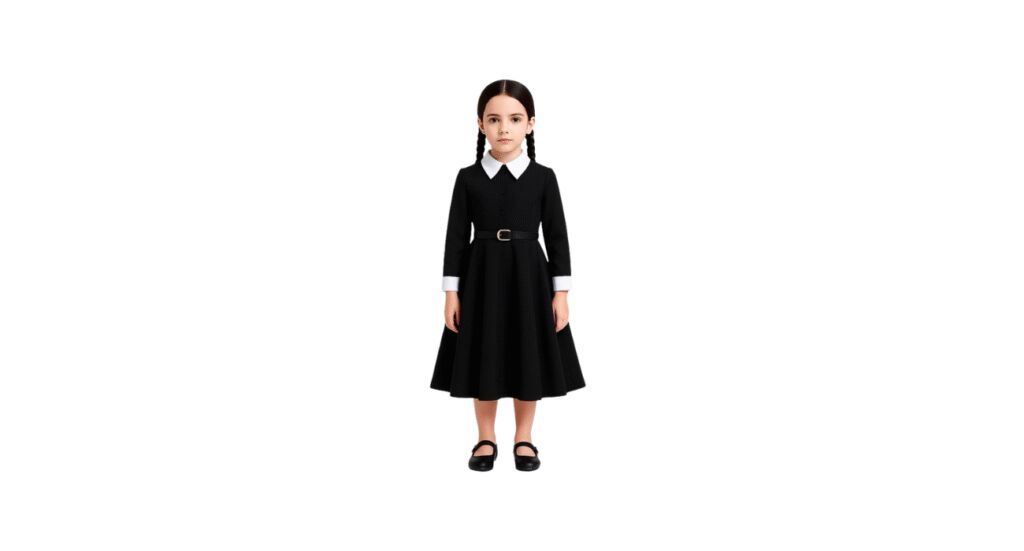 Zwarte vlechten, een serieus gezicht en natuurlijk dat iconische zwarte jurkje: met een Wednesday Addams-kostuum steel je gegarandeerd de show. Voeg nog wat donkere lippenstift toe en klaar is je mini-Wednesday. Je shopt dit Halloween kostuum hier.