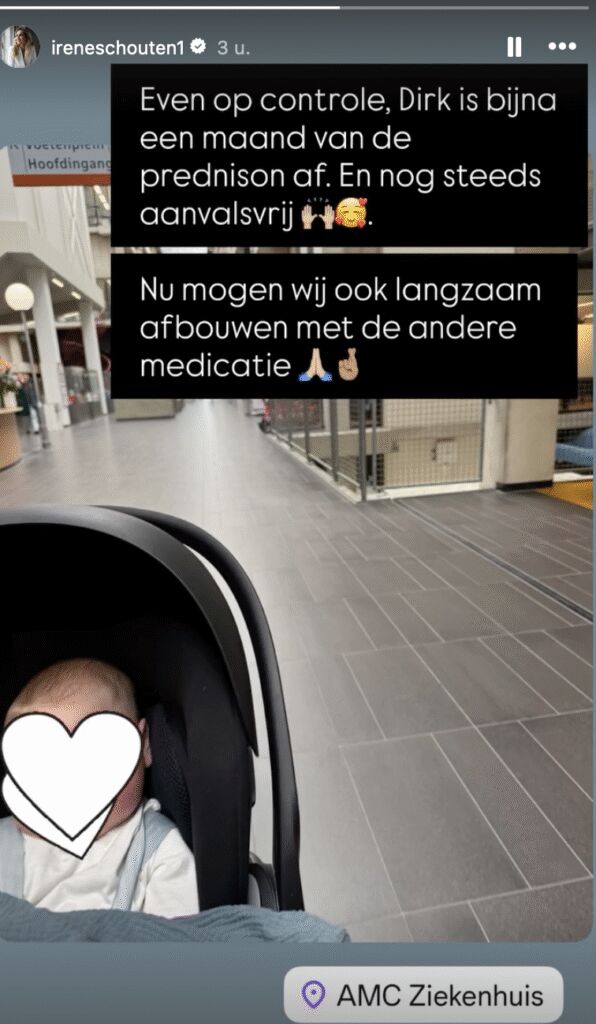 Op Instagram deelt Irene dat Dirk inmiddels al bijna een maand zonder prednison is. “Nog steeds aanvalsvrij”, schrijft ze hoopvol bij een update vanuit het ziekenhuis.
