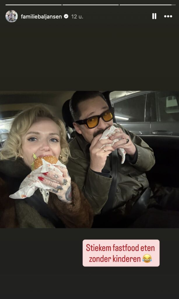 Hun ultieme quality time? Samen in de auto zitten met een dampende zak burgers op schoot. De auto, geparkeerd op een rustig plekje, verandert voor even in hun eigen mini-date night, zo is te zien in hun story op Instagram. Stoelen iets naar achter, muziek zachtjes aan en twee grote burgers die nét iets te enthousiast zijn belegd.