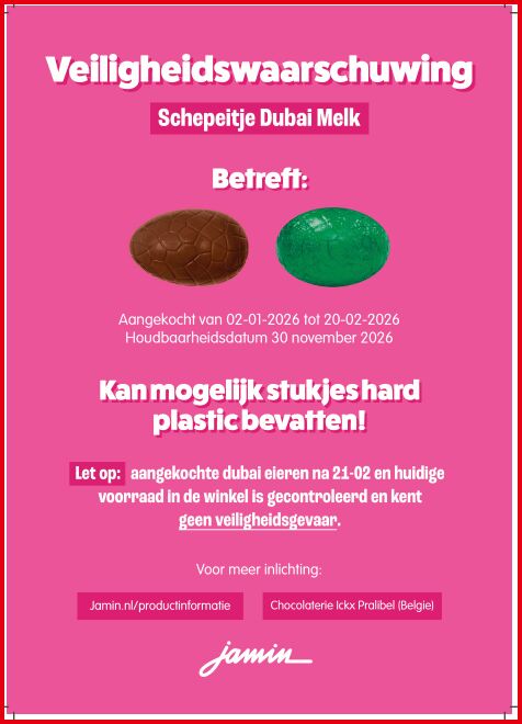 Het gaat om de paaseitjes in de smaak Dubai Melk, herkenbaar aan de groene wikkel.