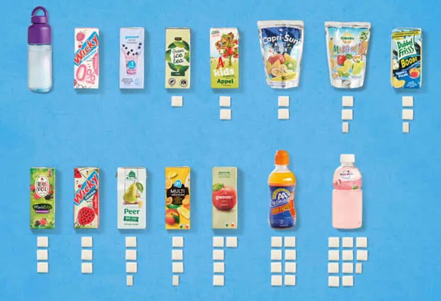 Je denkt een verantwoorde keuze te maken, maar ondertussen slurpt je kind (of jijzelf) ongemerkt een halve suikerpot leeg. De nieuwe suikerklontjesposter van Het Voedingscentrum liegt er niet om en wordt daarom verspreidt basis- en middelbare scholen.