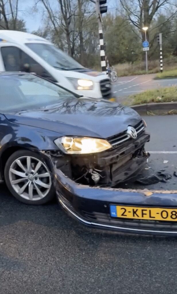 Op de gedeelde foto is duidelijk te zien hoe zwaar beschadigd zijn auto is. De bumper ligt los op de grond en de voorkant van het voertuig is volledig vernield. Omstanders, politie, ambulance en bergingsdiensten waren snel ter plaatse om te helpen.