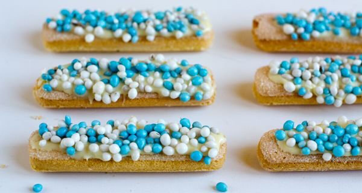 Voor als je het klein en simpel wilt houden. Het enige wat je hoeft te kopen zijn lange vingers, witte chocolade en blauwe of roze muisjes (of een mix, als het geslacht van de kleine nog een verrassing is). Smelt de chocolade au bain marie – boven een pannetje heet water – of in de magnetron en smeer die met een lepel of kwastje over de lange vingers. Dip elke vinger in de muisjes en laat stollen. Recept: Brenda Kookt.